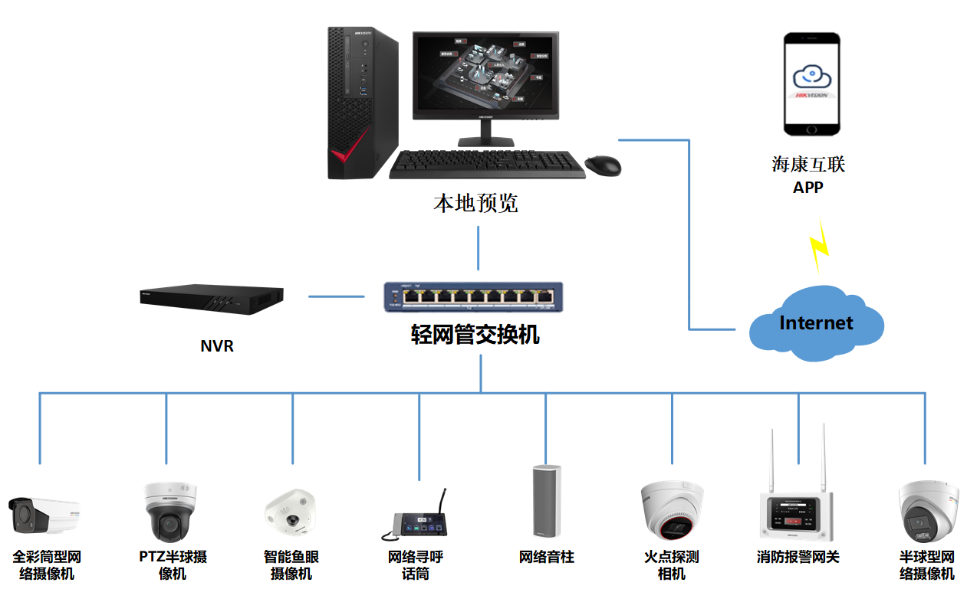 互联一体机1000C应用方案如图2所示。在出入口,前端摄像头推送消息到互联平台一体机1000C上进行弹窗报警,方便管理人员第一时间进行处理,减少财产被盗风险及损失。